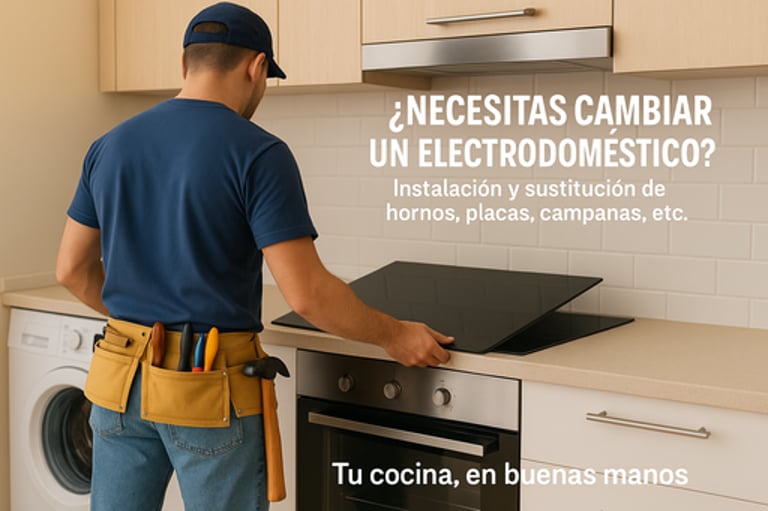 Muebles, ventiladores, cortinas, apliques de baño, soportes T.V, ventiladores de techo. Sustitución de electrodomésticos, horno, vitrocerámica, campana extractora, zapateros...