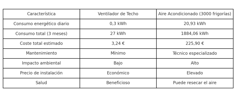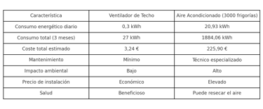 Los cálculos se han realizado usando una tarifa eléctrica de 0,1199 €/kWh (Iberdrola Plan Online, mayo 2025). Se ha estimado un ventilador de techo con consumo medio de 50 W y un aire acondicionado de 3000 frigorías (≈ 3,49 kWh/hora).